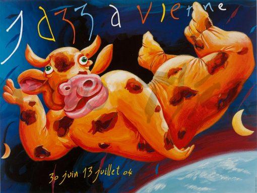 J’avais envie d’une affiche joyeuse, déjà pour effacer l’histoire de l’année précédente et surtout non attaquable. Elle allait bien avec une certaine image que l’on voulait redonner au festival : clin d’oeil, douce folie, on s’éclate…Elle permettait d’avoir des déclinaison très drôles, des bus aux fonds de scène.Il y a même eu le projet avec radio France de mettre une énorme vache volante sur la maison de la radio, un peu comme un dirigeable qui y serait arrimé. Mais c’est resté au stade de l’idée. Les tee- shirts étaient vendus dans des boites (vache) à camenbert.
